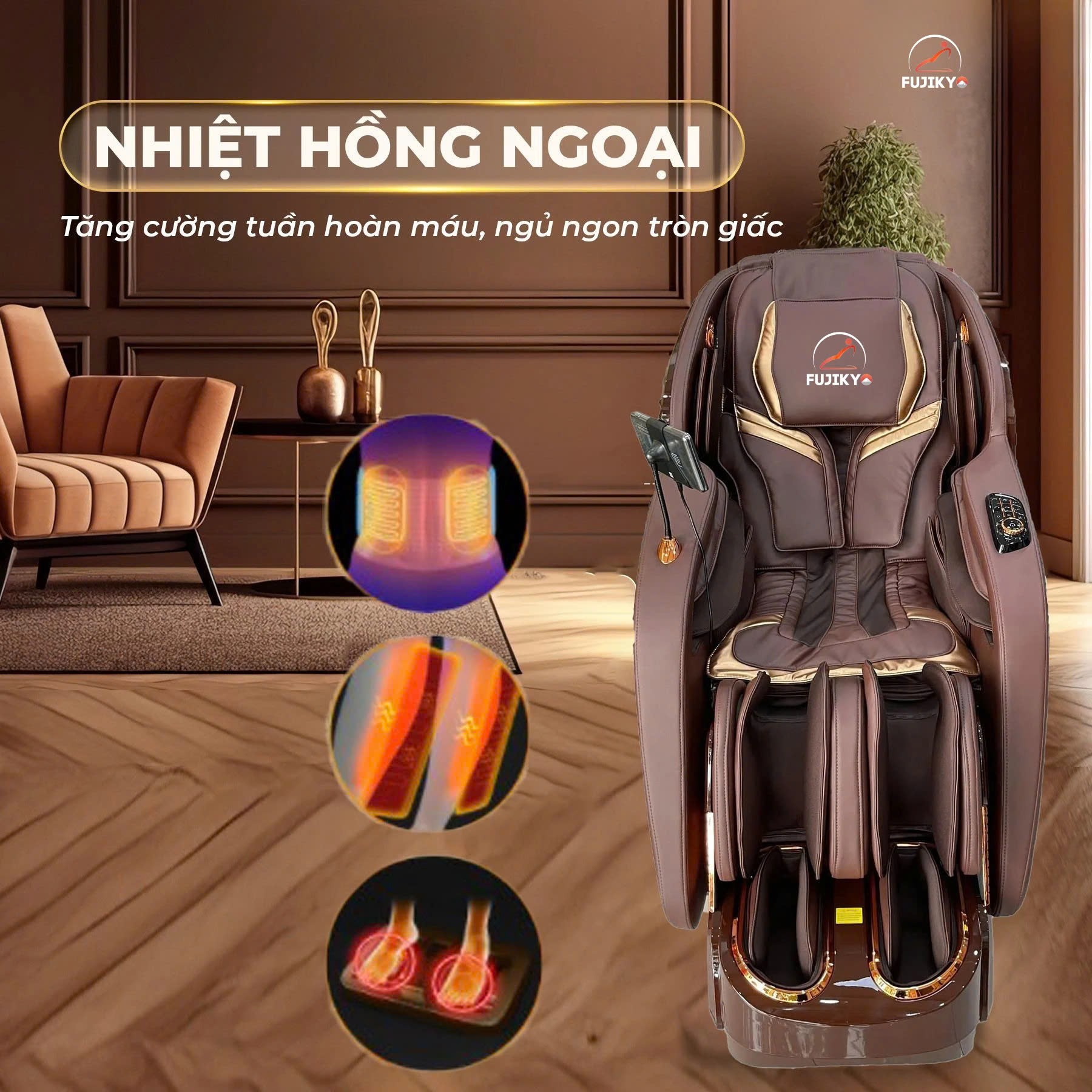 Hệ thống nhiệt hồng ngoại trên ghế massage FK 900 được bố trí tại nhiều vị trí như lưng, eo và bắp chân, dải nhiệt ở vai. Mức nhiệt duy trì 40°C – 45°C giúp cơ thể được làm ấm nhanh chóng. Kết hợp với thao tác xoa bóp, massage của con lăn và túi khí, giúp cơ thể giảm đau nhanh chóng, tăng cường lưu thông máu tới các chi. Đồng thời mang lại cảm giác dễ chịu, giải phóng các vùng cơ bị căng cứng và giúp người dùng có giấc ngủ ngon hơn.